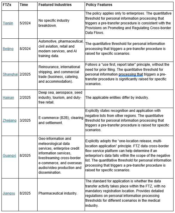 The negative lists for data cross-border transfer management in Free Trade Zones (FTZs) are an important supplement to China's existing pre-transfer compliance system, which primarily relies on security assessments, personal information protection certifications, and standard contracts for cross-border personal information transfers. The 2024 Provisions on Promoting and Regulating Cross-border Data Flows empower FTZs to create their own negative data lists within the national data classification and grading framework. Data not on the list can be freely transferred overseas. With the release of the 2025 China (Guangxi) Free Trade Zone Data Cross-border Transfer Management List (Negative List) on August 4, followed by the Trial Measures for the Management of Data Cross-border Transfer Negative List in the China (Jiangsu) Free Trade Zone and the 2025 China (Jiangsu) Free Trade Zone Data Cross-border Transfer Management List (Negative List) on August 13, a total of seven negative lists are now in effect across China, including those from Beijing, Tianjin, Shanghai, Zhejiang, and Hainan.