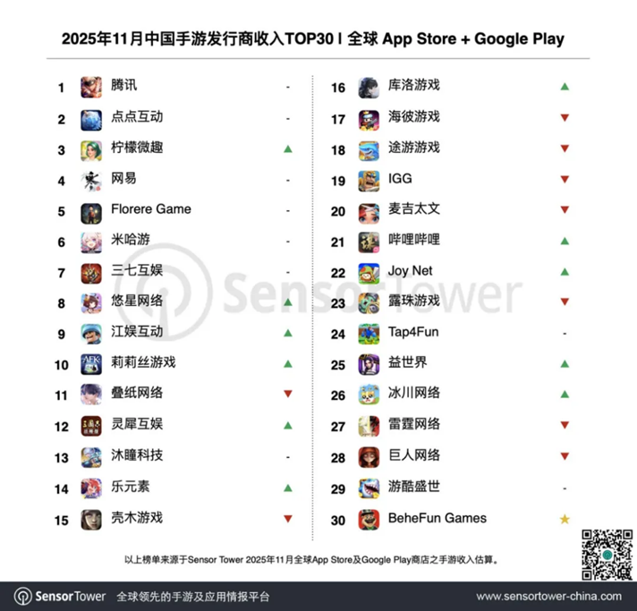 Sensor Tower:33家中国厂商入围2025年11月全球手游发行商收入榜TOP 100,合计收入达19.5亿美元;腾讯、点点互动和柠檬微趣分列发行商收入榜前三位