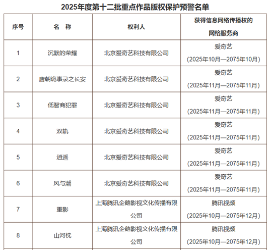 - 国家版权局发布2025年度第十二批重点作品版权保护预警名单,涵盖《沉默的荣耀》《新闻女王2》等热播影视剧