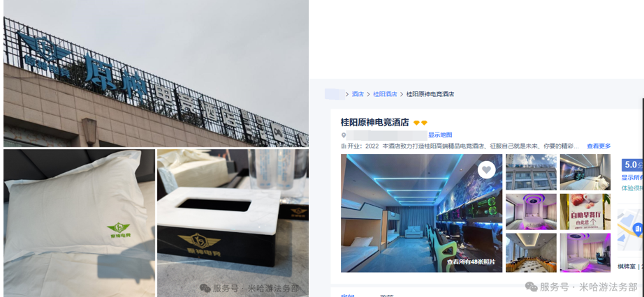 侵权电竞酒店在户外招牌、枕头等醒目位置使用“原神”相关标识(左图);米哈游起诉后,该酒店在某旅行网站中仍使用“原神电竞酒店”名称进行推广(右图)