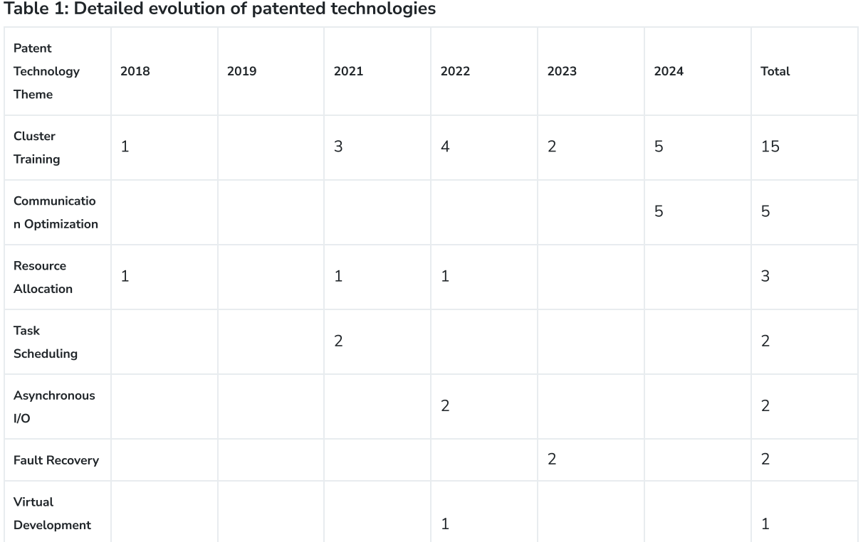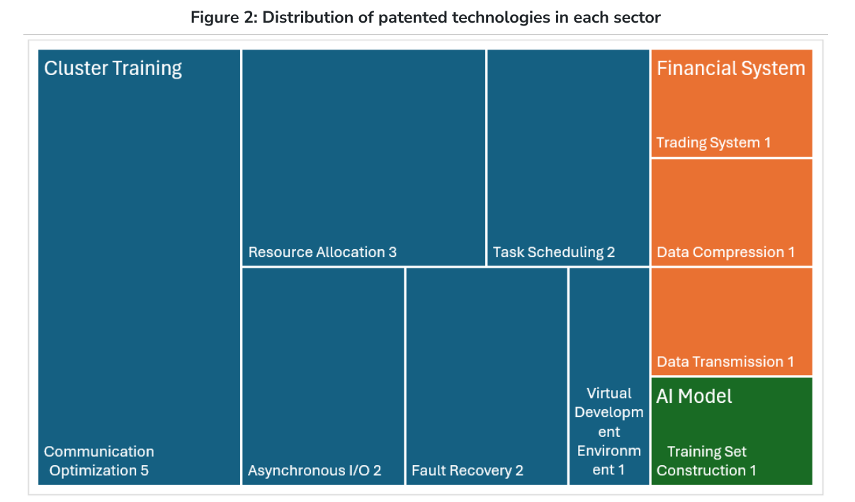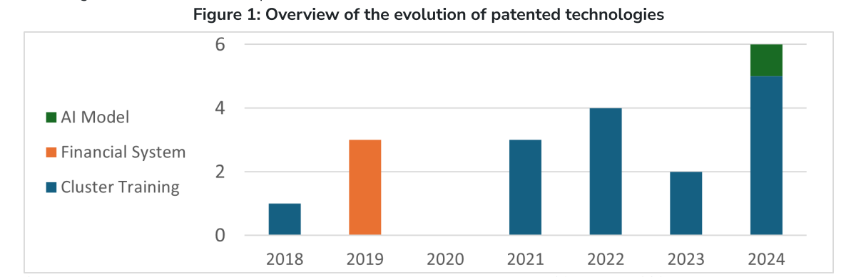 - Patent applications demonstrate a distinct technological focus, primarily distributed across cluster training, financial technology applications, and AI models