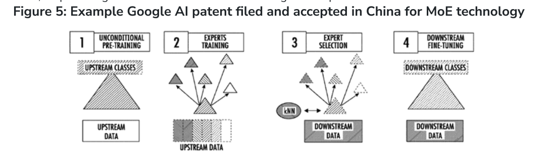 As a reference, Google's patent application CN115699041A (see Figure 5 below) proposes a transfer learning framework based on a mixture of experts (MoE), solving traditional transfer computation redundancy issues through pre-training multidomain expert models, dynamic performance evaluation, and adapter fine-tuning, improving cross-task generalisation efficiency and meeting the needs of visual tasks in low-data scenarios.