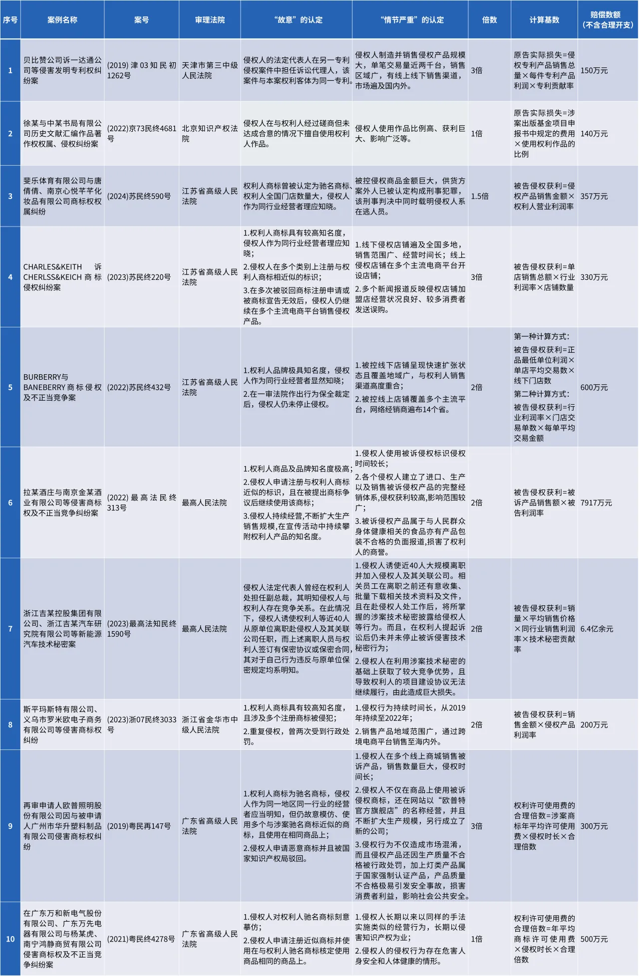 In light of the above issues, we have sorted out typical cases of punitive damages for intellectual property infringement in recent years, summarized the factors considered by the courts when determining the elements of “intent” and “serious circumstances,” and listed the methods for determining the calculation base, the multipliers and the final total amount of damages: