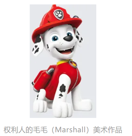 "PAW Patrol" is a representative series of animated works of Spin Master Ltd. The right holder owns the artistic work "PAW Patrol Cartoon Characters," which includes the cartoon character image named Marshall—a white spotted dog wearing a red vest, a red helmet and a yellow collar, with a shield-shaped badge on its chest—embodying original artistic design.
